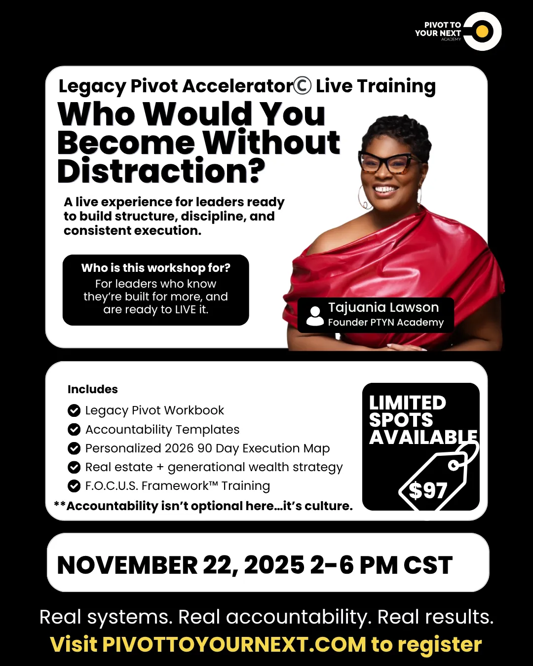 Legacy Pivot Workbook: A guided workbook designed to help you break old patterns, clarify your purpose, and step into your highest identify. Inside, you'll map your goals, define your next level, and build a mindset rooted in discipline, clarity, and legacy.